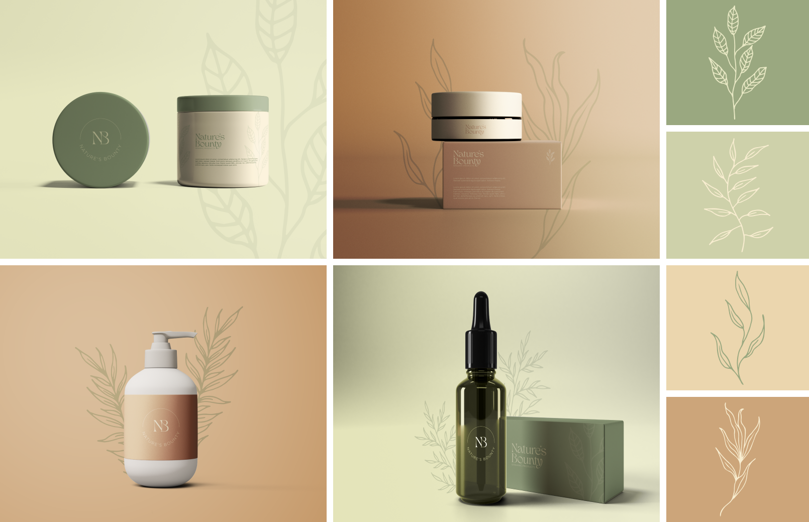 Branding, Identity and packaging for Nature’s Bounty, a startup that embodies organic simplicity and lightness. Its elegant serif typographic logo conveys harmony and authenticity, supported by natural tones of green and brown to symbolize growth and earth. The minimalist design reflects the brand’s essence: pure, balanced, and connected to nature.