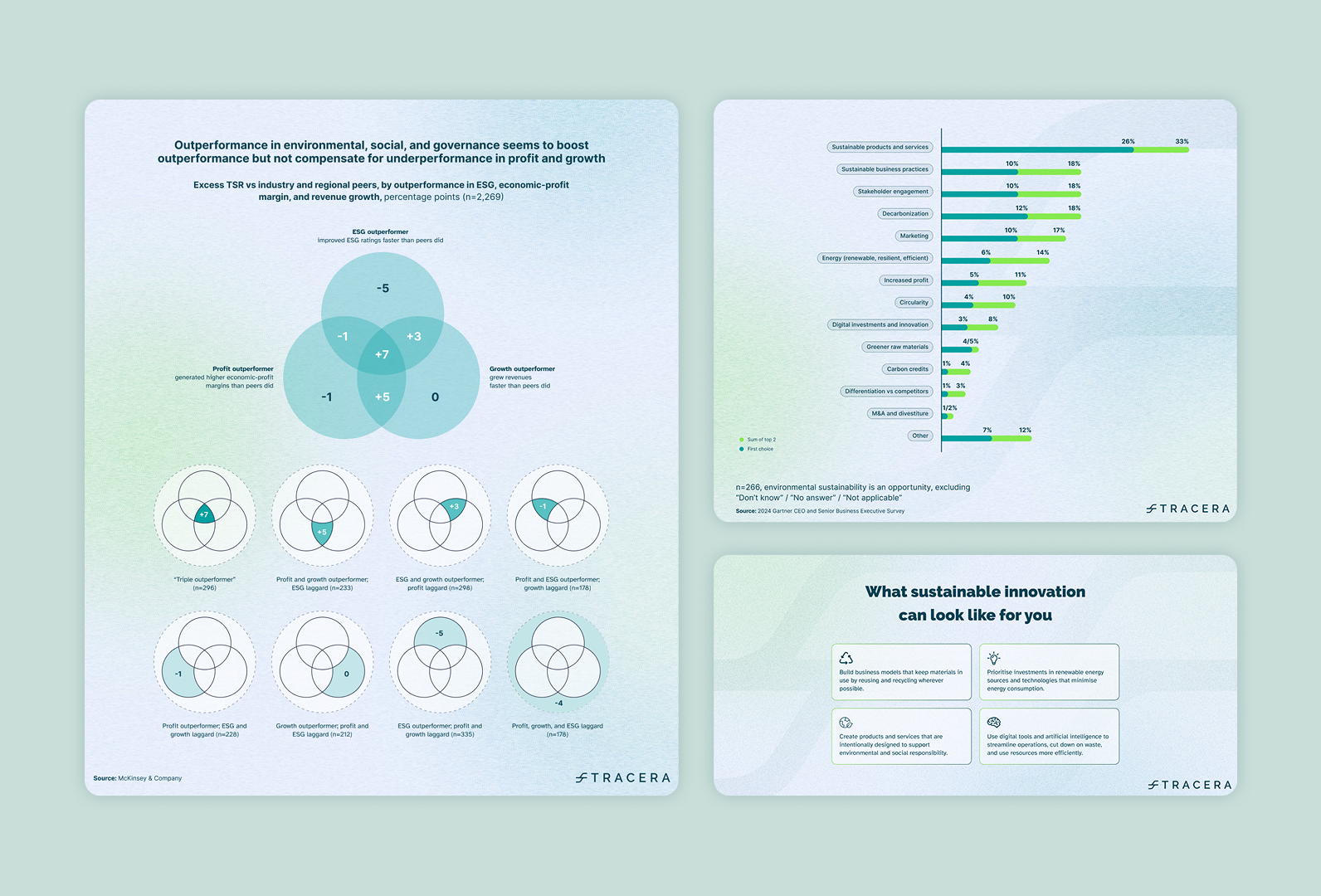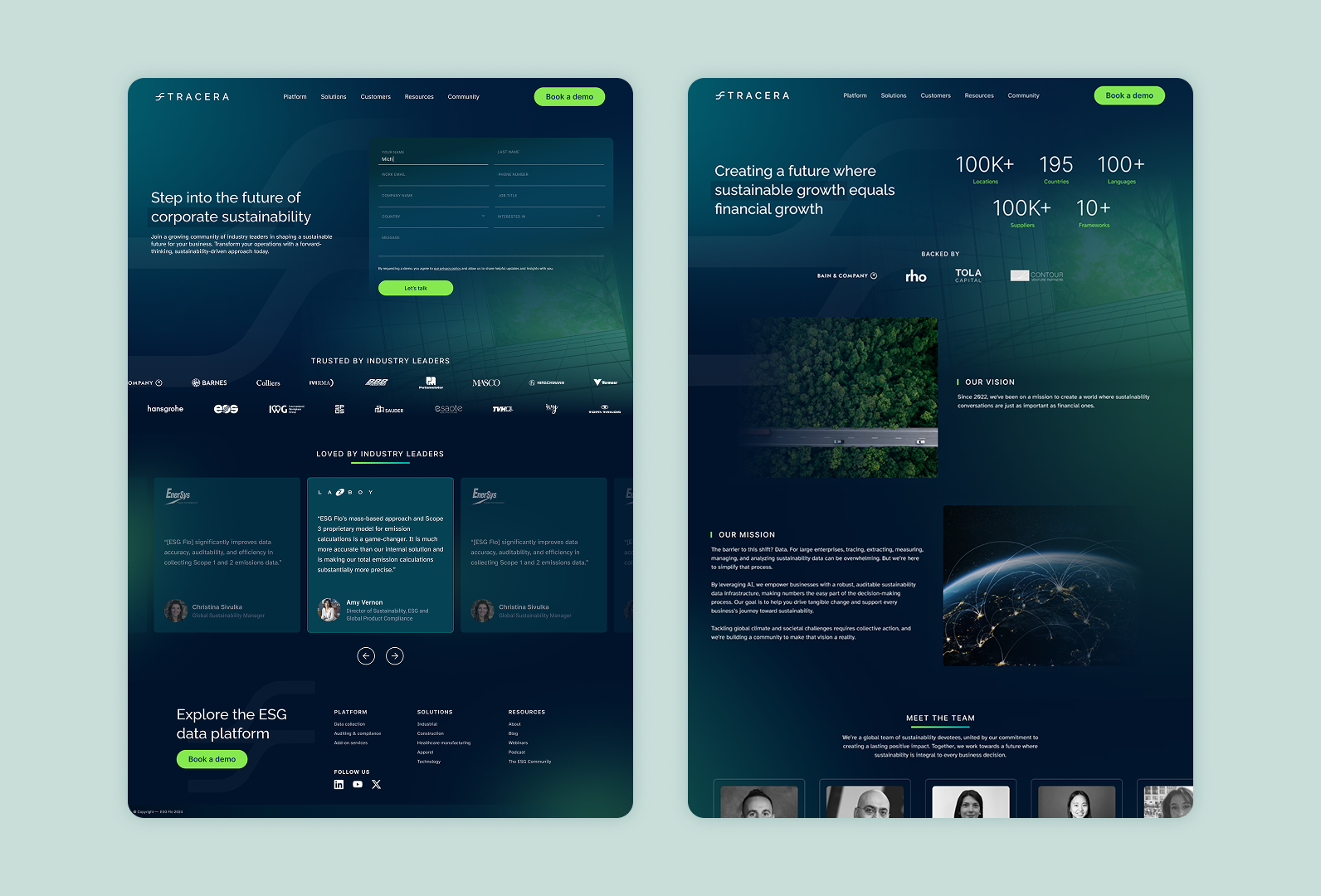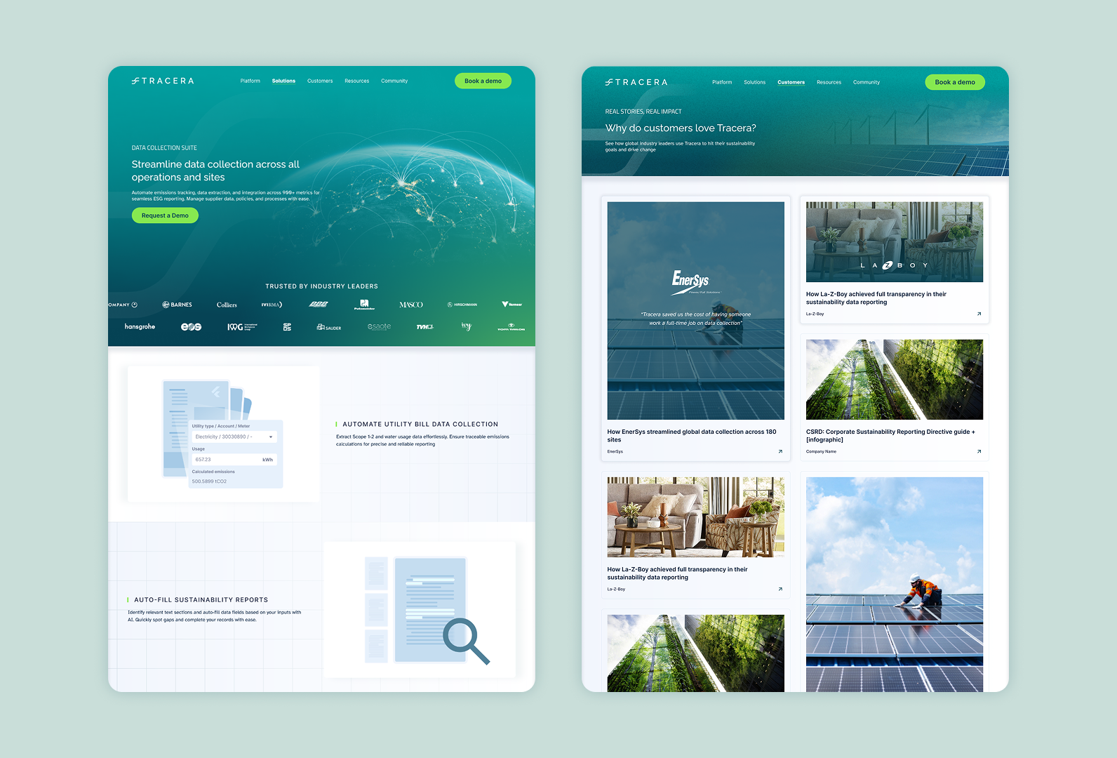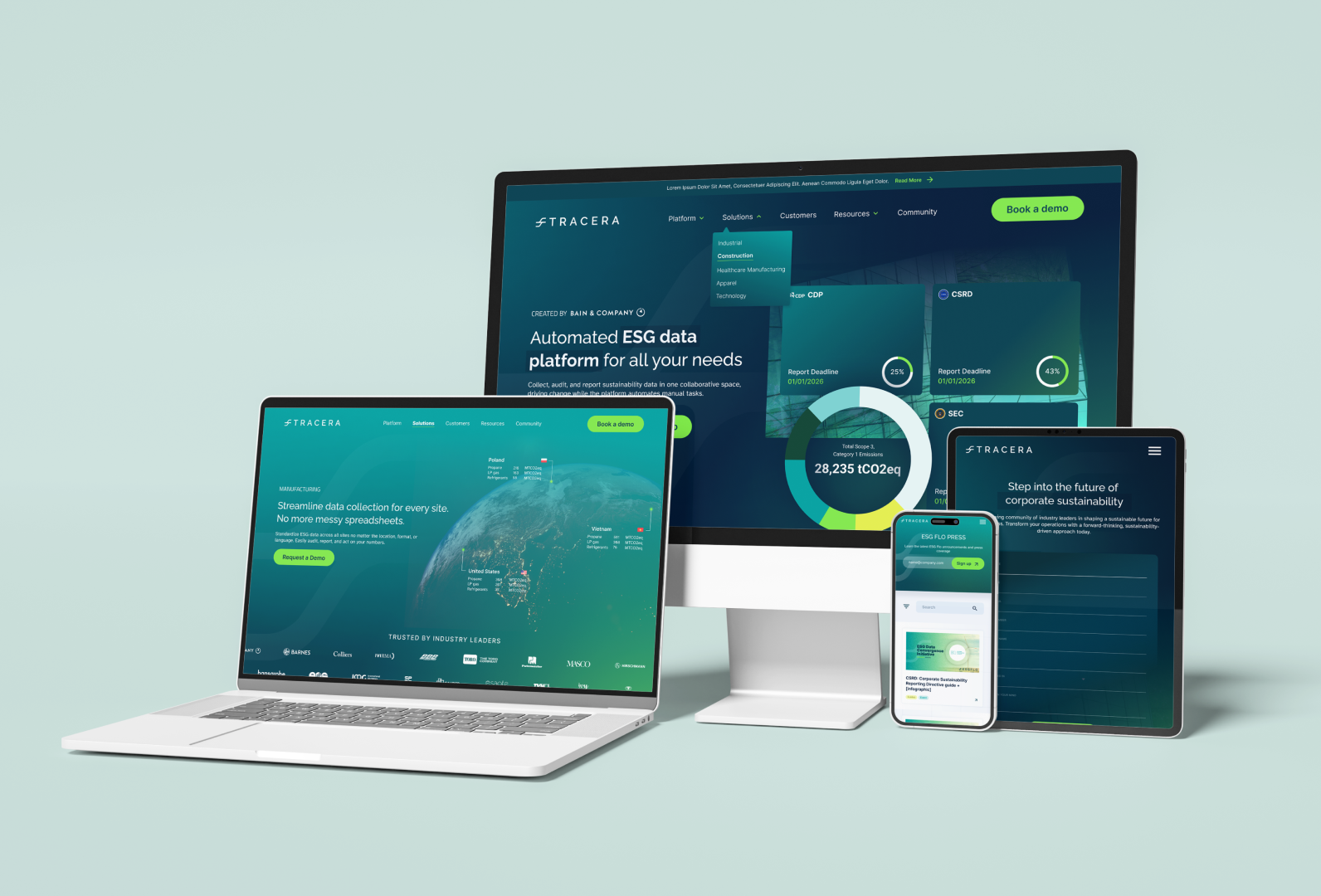 UI & Graphic Design for Tracera, a platform that consolidates corporate emissions and sustainability data into one centralized system, making audits simpler, compliance easier, and progress clearer. They offer solutions in data collection, carbon accounting, regulatory compliance, and advisory services to support enterprise-level sustainability efforts.